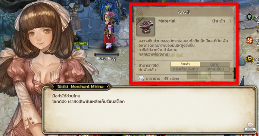 การตีบวกเพื่อเพิ่มพลังให้กับอุปกรณ์สวมใส่ ก่อนอื่นเราจะต้องไปหาซื้อ Anvil ที่ NPC Item Merchant ก่อน